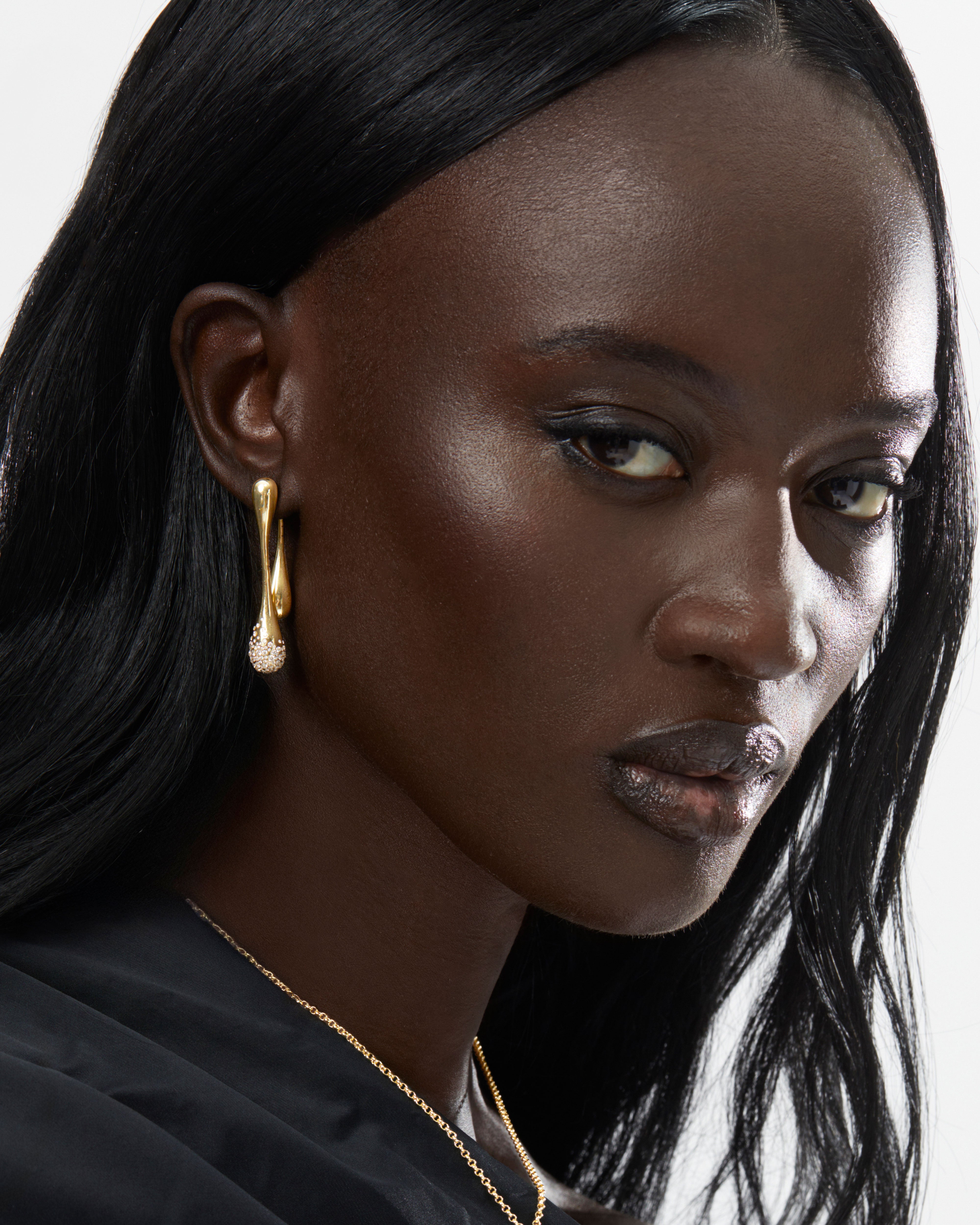 Sculptural elegance with radiant brilliance. This refined duo from the Silhouette Collection combines the structured curve of the signature bracelet with elongated teardrop earrings that shimmer beautifully with every movement. Crafted in triple-layer 18K gold plating and adorned with pavé-set moissanites, this set captures light from every angle for an effortlessly sophisticated look.
